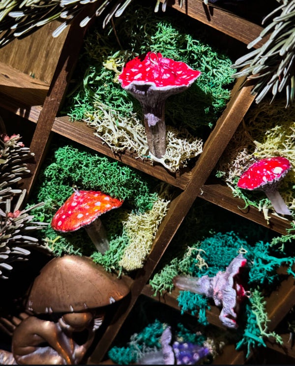 Each mushroom is hand crafted from natural clay, formed around a crystal & hand painted.