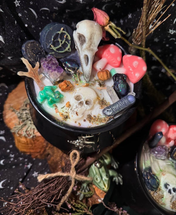 Large Cauldron Candle filled with a beautiful scents of Vanialla & burnt almond, topped with crystals & hand made wax melts fit for a Witches cauldron.