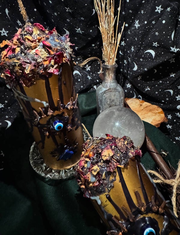 A golden pillar candle with a hand scribed eye. Filled with cross road dirt & covered with wax & anointing in oils, topped with Clove buds to seel in the essence of the road opening spell.
