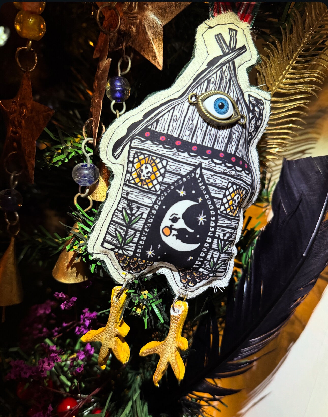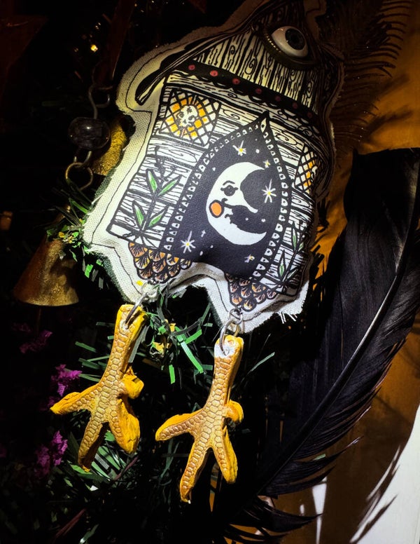 A beautiful handmade hanging hut stuffed with cloves & backed with the most beautiful soft green velvet. From illustration to the last stitch & clay chicken foot, this is a magical little hut from a Hedge witch.
